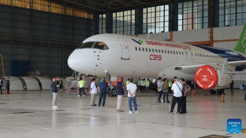 This photo taken on March 10, 2024 shows a Chinese airplane C919 developed by the Commercial Aircraft Corporation of China, Ltd. (COMAC) during a static display at Soekarno-Hatta International…
