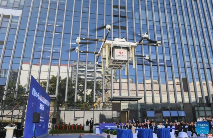 A drone carrying blood takes off for the Shenzhen Traditional Chinese Medicine Hospital from the Shenzhen Blood Center in Shenzhen, south China's Guangdong Province, Jan. 19, 2024. A blood transportation…
