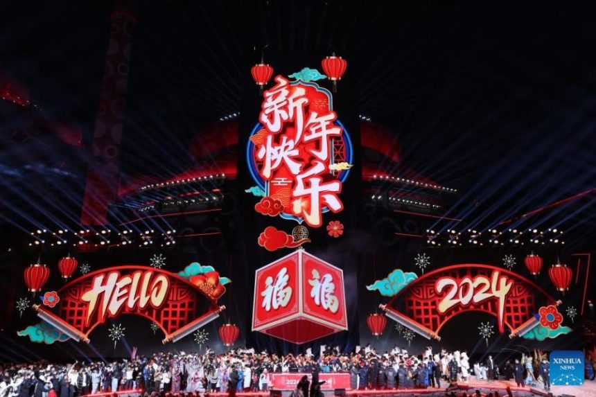 People wait for the New Year bell tolls at the Drum Tower in Tianjin, north China, Jan. 1, 2024. Various events are held across the country to celebrate the New…