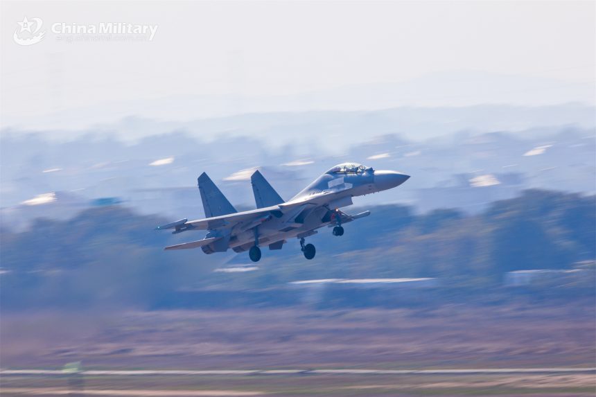 A fighter jet attached to an aviation brigade of the air force under the PLA Eastern Theater Command stands on the runway during a flight training exercise on December 1,…