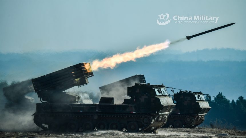 Vehicle-mounted multiple launch rocket systems attached to a brigade under the PLA 73rd Group Army fire at mock target during a live-fire training exercise on October 30, 2023. The brigade…
