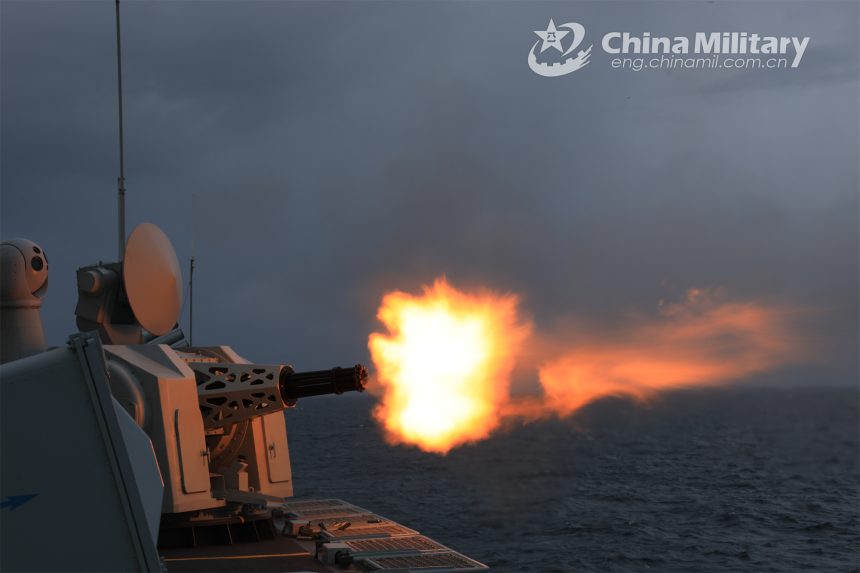 A frigate attached to a frigate flotilla with the navy under the PLA Southern Theater Command fires its close-in weapons system during a maritime training exercise in mid November, 2023.…