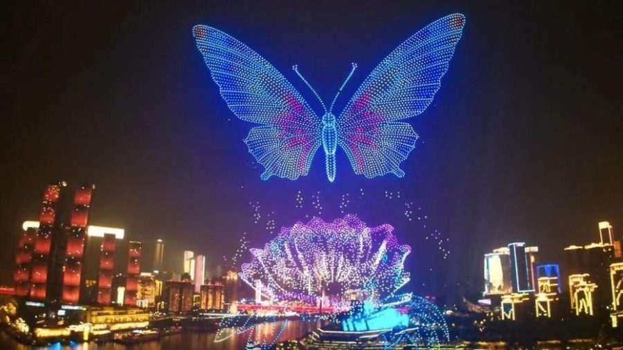 As the drones continuously shifted formation, they assembled a series of images drawn from traditional Chinese symbolism, including the Die Lian Hua motif (butterflies and flowers), a soaring eagle, and an auspicious gourd.